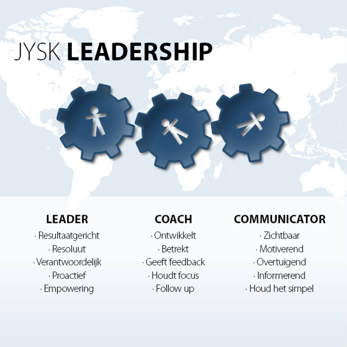Naast onze Values, verwachten wij van onze leidinggevenden dat zij JYSK Leadership tonen. Dat betekent dat zij zowel Leider, Coach als Communicator zijn voor hun team.