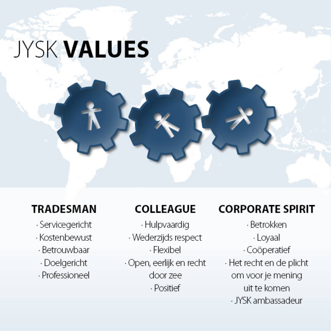 Onze drie fundamentele JYSK Values - Ondernemer, Collega en Bedrijfscultuur - zijn afkomstig van onze oprichter, Lars Larsen. Je kan het bekijken als ons "JYSK DNA" oftewel de manier waarop we bij JYSK met elkaar omgaan.