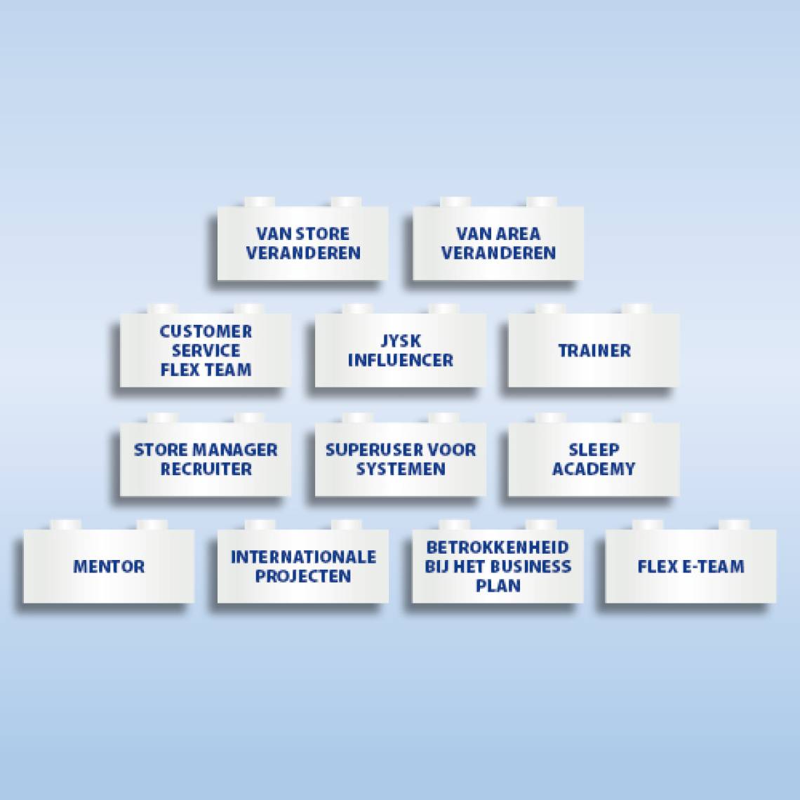 Met het "Choose your own brick" programma, willen we jou als JYSK medewerker tde kans geven om jezelf te ontwikkelen in jouw huidige rol. Het doel van "Choose your own brick" is om: